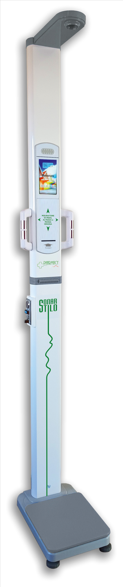 La bilancia SONAR STILO misura automaticamente peso, altezza e massa grassa; trasmette a voce e stampa il ticket con i valori. Pieghevole, facile da trasportare e posizionare grazie alle ruote posteriori.